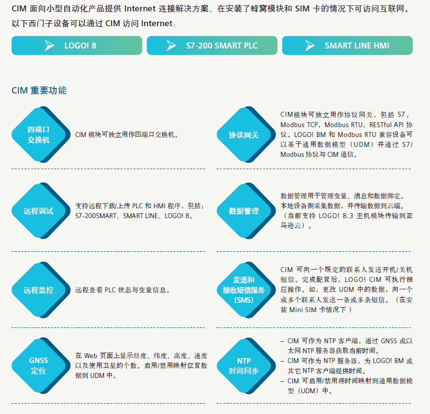 工业物联网网关CIM 面向小型自动化产品提供 Internet 连接解决方案,在安装了蜂窝模块和 SIM 卡的情况下可访问互联网。